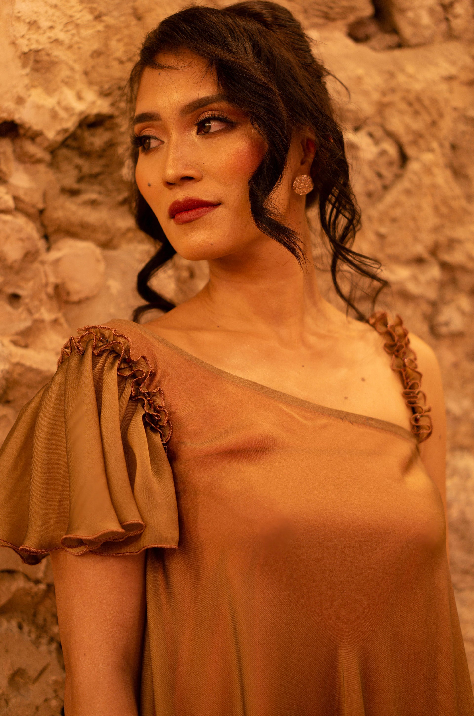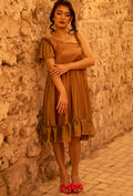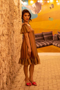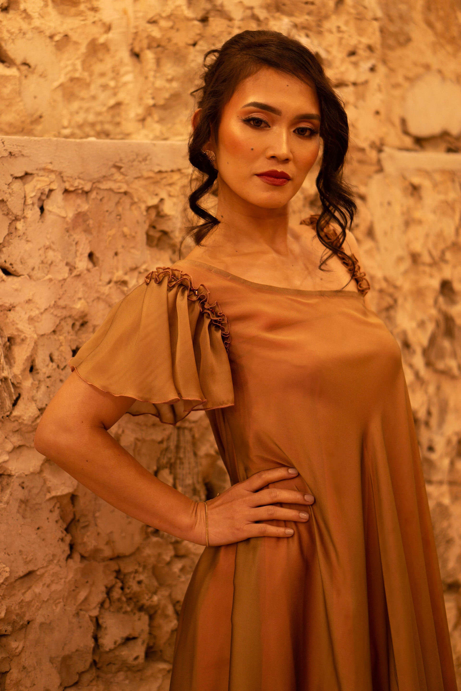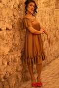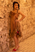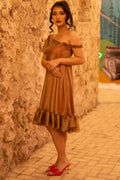 Whether it’s a party or a wedding event; you can look like a doll and embrace your childhood dream! The metallic Brown represents maturity while the gradient of pink lining gives off a hint of playfulness and sweetness. This one shoulder dress with frills will leave everyone in awe!